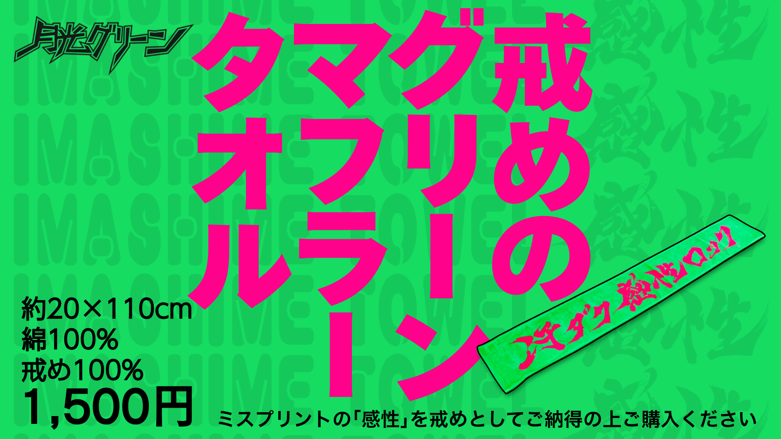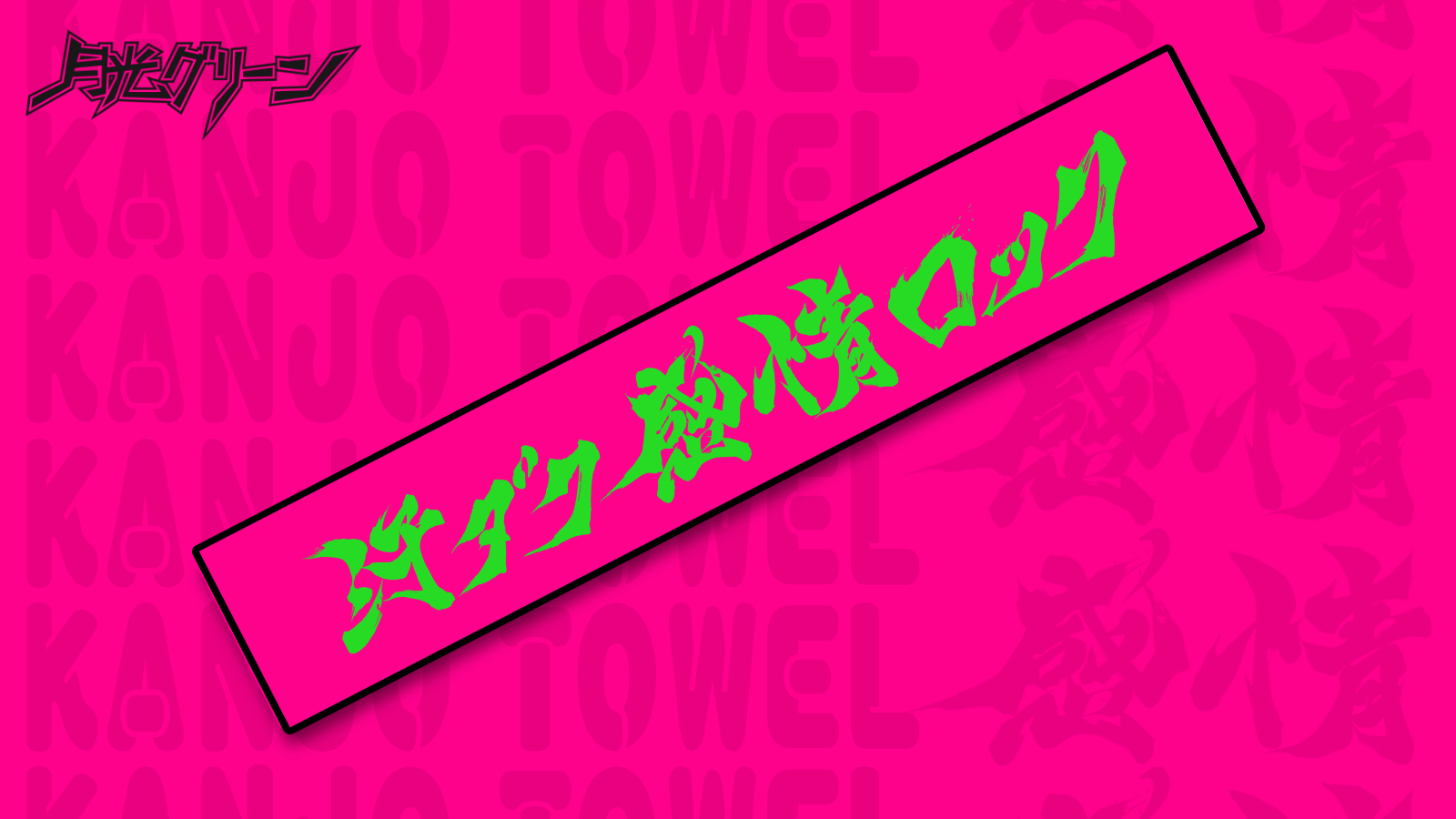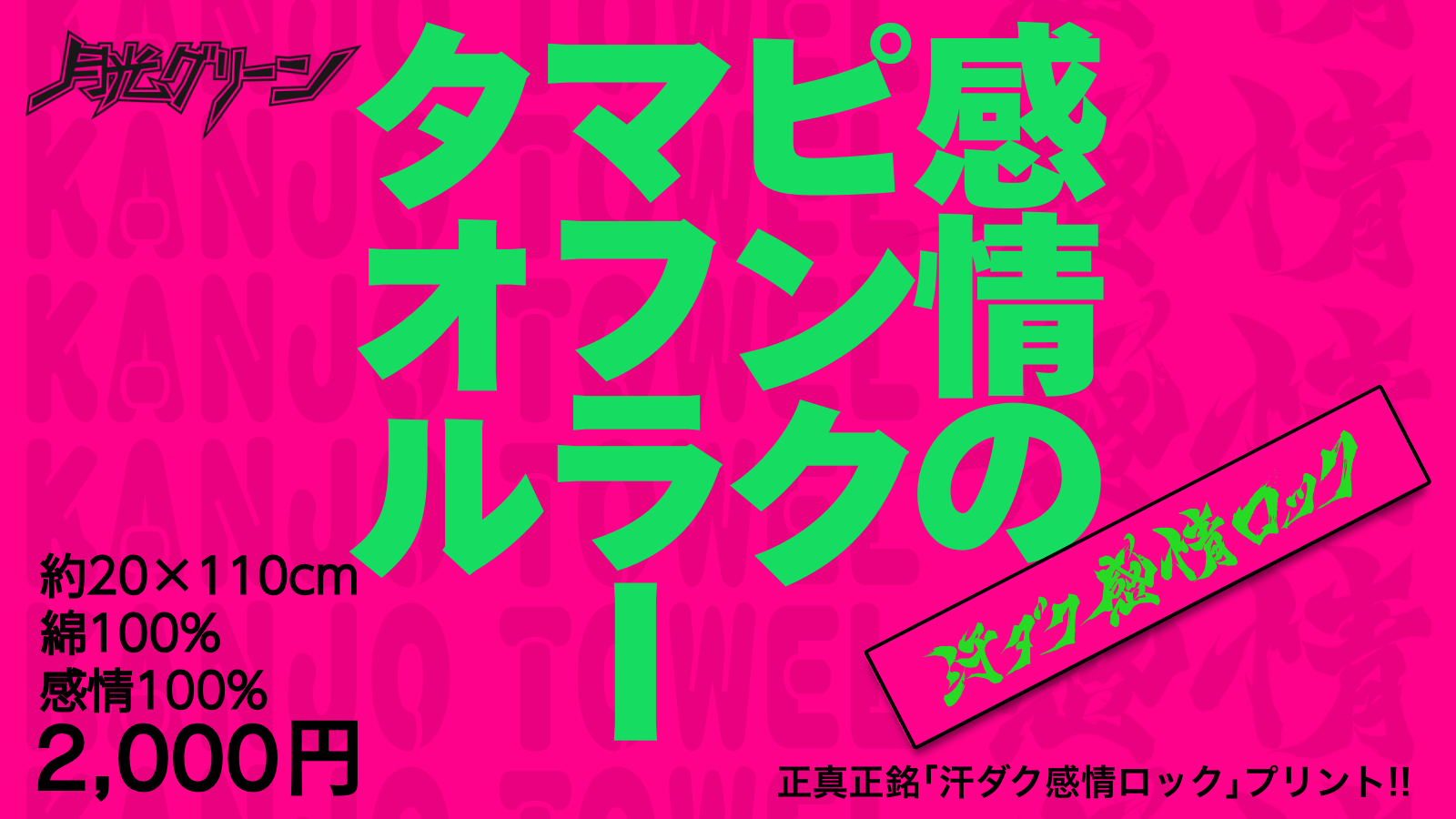Goods 3/21(土) 新グッズ『感情のピンクマフラータオル』発売決定 2026 年 3 月 19 日 月光グリーンの新グッズ発売が決定いたしました。 汗ダク感情ロックをプリントしたマフラータオルを2,000円で販売いたします。 <発売日> 2026/03/21(土)より ライブ会場にて販売開始 ミスプリントマフラータオルは戒め価格1,500円で好評販売中!